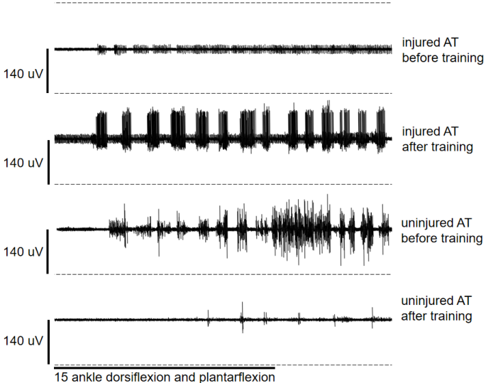 图3患者训练前后的表面肌电图对比表明,经过VR训练,患者的患肢肌肉得到了显著增强。