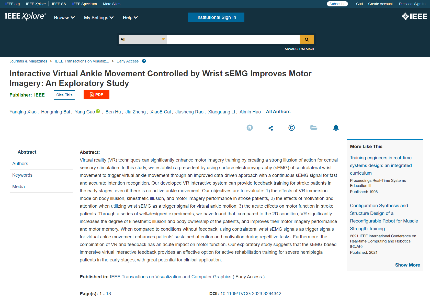 近日,虚拟现实领域的顶级期刊IEEE Transactions on Visualization and Computer Graphics (TVCG)刊发了北航虚拟现实技术与系统全国重点实验室郝爱民教授联合北航生物医学工程高精尖创新中心李晓光教授团队在虚拟现实技术促进脑卒中康复方面的新进展:《Interactive virtual ankle movement controlled by wrist sEMG improves motor imagery: an exploratory study》。
